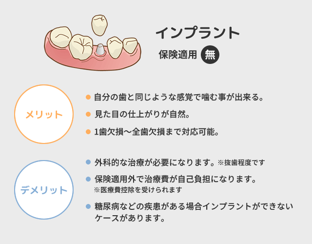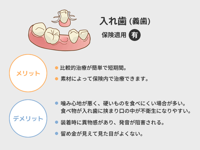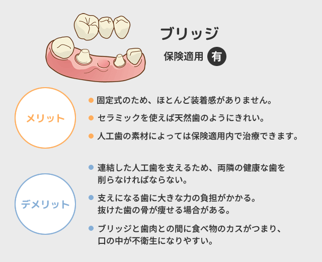 歯を失った後、そこに歯を入れていく必要があります。失った歯の部位・本数により選択できる治療は異なります。ここではインプラント、ブリッジ、入れ歯のメリット・デメリットをお話させて頂きます。