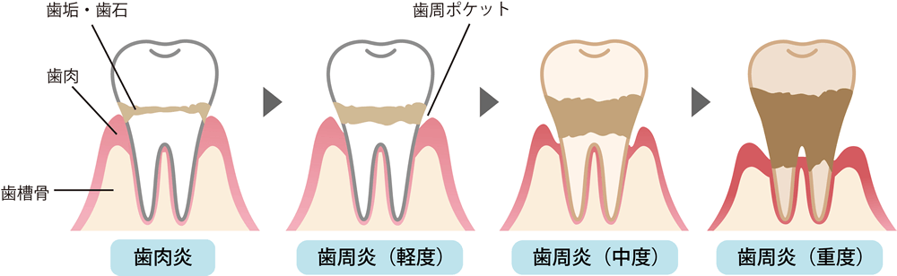 歯周病が進行して深くなった歯周ポケットでは歯周病菌がさらに増殖し、炎症が起きている部分は傷が開いたような状態になり、ここから血管に細菌が入りやすくなります。動脈硬化、糖尿病だけでなく歯周病菌が危険因子となる病気は幅広く考えられます。適切なブラッシング(歯磨き)をはじめ、高い予防意識が必要です。